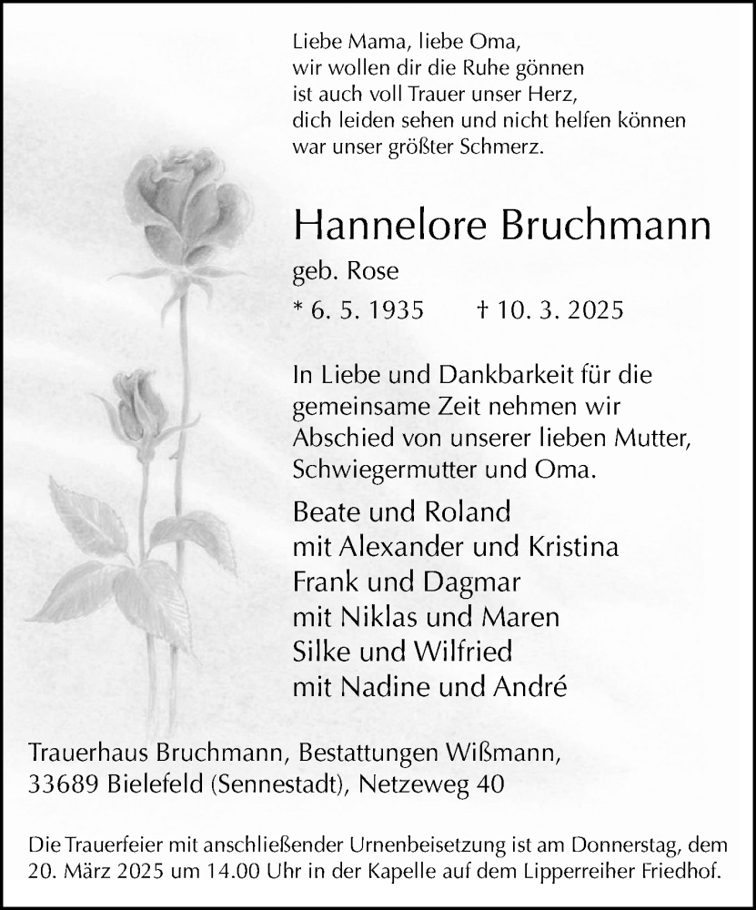 Hier finden Sie alle Traueranzeigen aus der Zeitung, die bisher für Hannelore Bruchmann erschienen sind. Weitere Traueranzeigen, die in der Zeitung erscheinen, werden hier ebenfalls aufgelistet