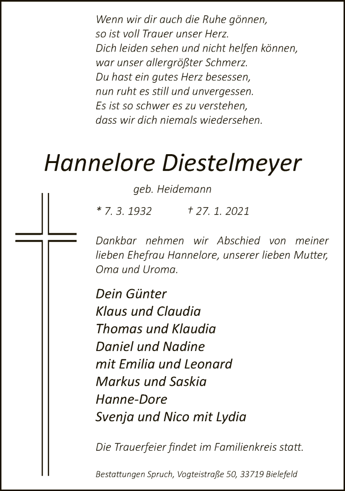 Hier finden Sie alle Traueranzeigen aus der Zeitung, die bisher für Hannelore Diestelmeyer erschienen sind. Weitere Traueranzeigen, die in der Zeitung erscheinen, werden hier ebenfalls aufgelistet