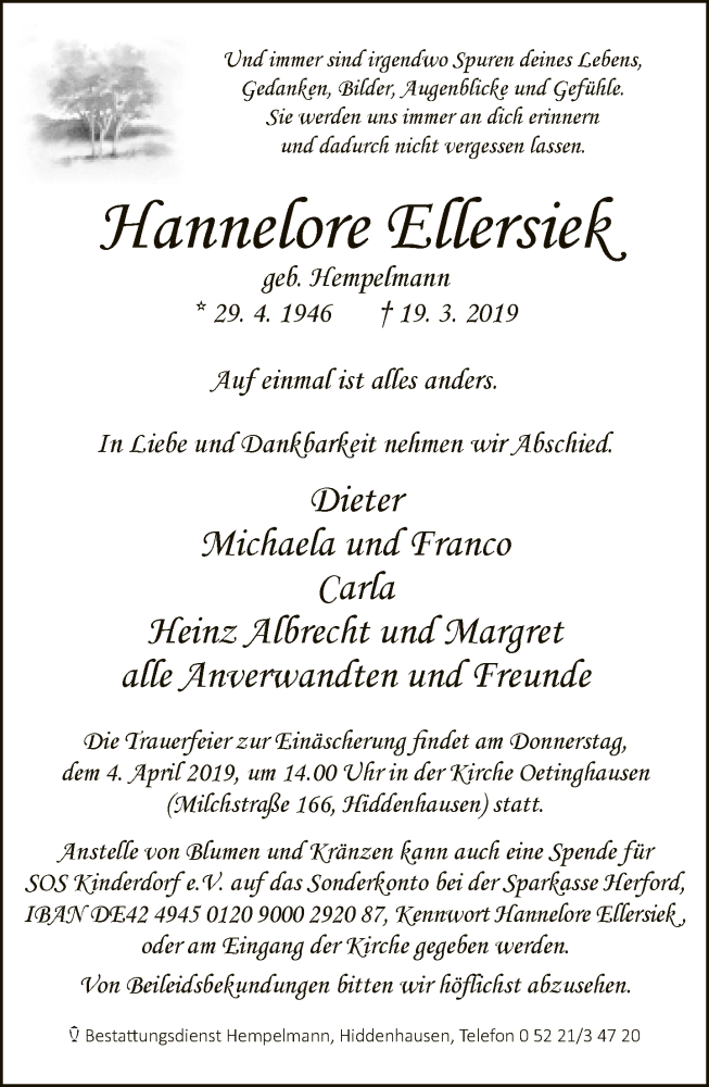 Hier finden Sie alle Traueranzeigen aus der Zeitung, die bisher für Hannelore Ellersiek erschienen sind. Weitere Traueranzeigen, die in der Zeitung erscheinen, werden hier ebenfalls aufgelistet