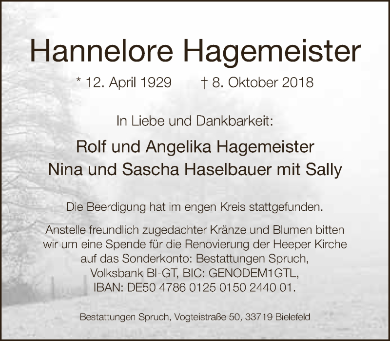 Hier finden Sie alle Traueranzeigen aus der Zeitung, die bisher für Hannelore Hagemeister erschienen sind. Weitere Traueranzeigen, die in der Zeitung erscheinen, werden hier ebenfalls aufgelistet