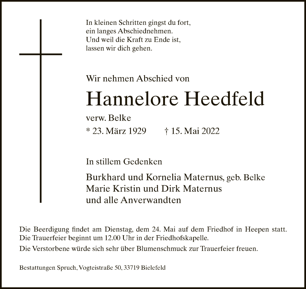 Hier finden Sie alle Traueranzeigen aus der Zeitung, die bisher für Hannelore Heedfeld erschienen sind. Weitere Traueranzeigen, die in der Zeitung erscheinen, werden hier ebenfalls aufgelistet
