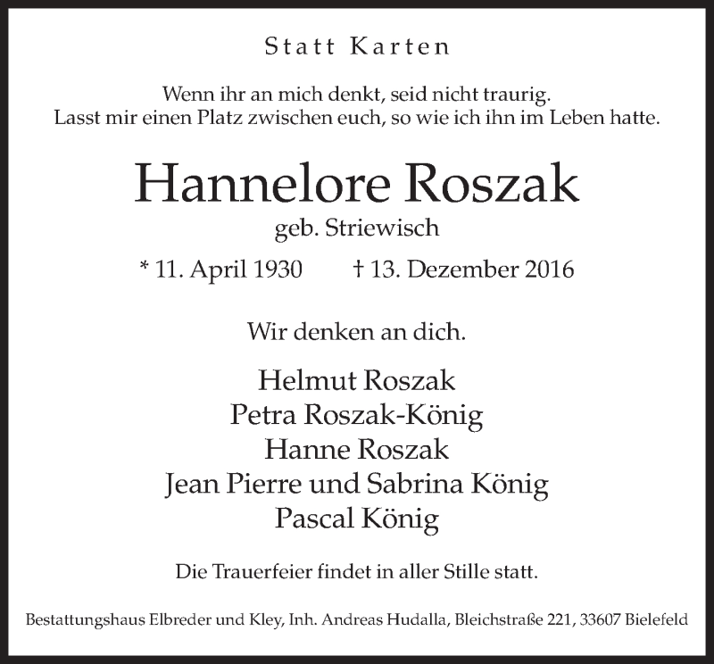 Hier finden Sie alle Traueranzeigen aus der Zeitung, die bisher für Hannelore Roszak erschienen sind. Weitere Traueranzeigen, die in der Zeitung erscheinen, werden hier ebenfalls aufgelistet