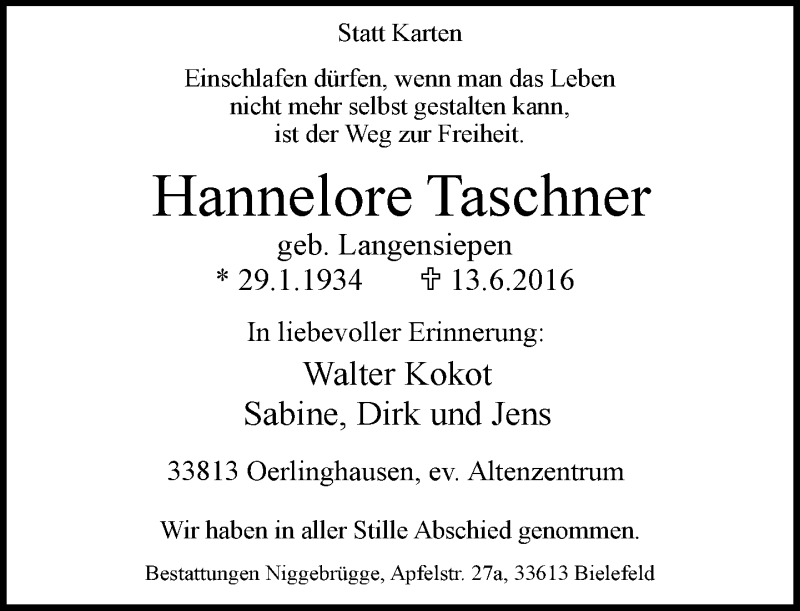 Hier finden Sie alle Traueranzeigen aus der Zeitung, die bisher für Hannelore Taschner erschienen sind. Weitere Traueranzeigen, die in der Zeitung erscheinen, werden hier ebenfalls aufgelistet