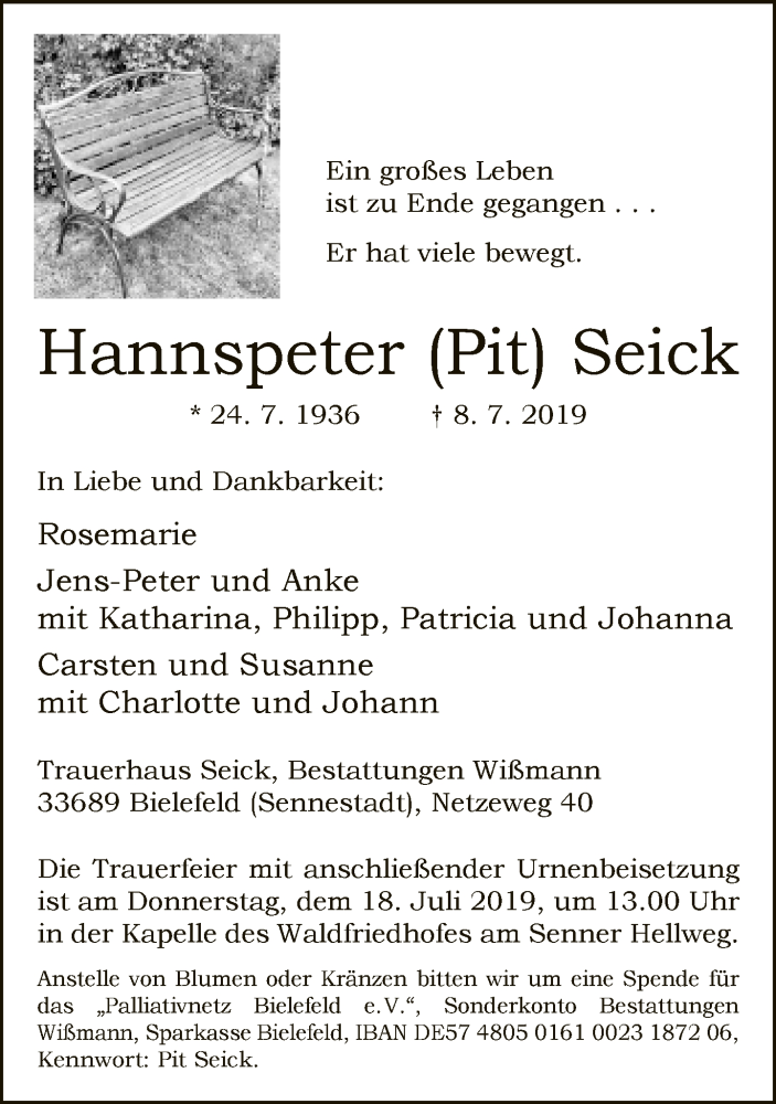 Hier finden Sie alle Traueranzeigen aus der Zeitung, die bisher für Hannspeter Seick erschienen sind. Weitere Traueranzeigen, die in der Zeitung erscheinen, werden hier ebenfalls aufgelistet
