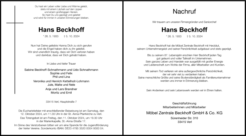 Hier finden Sie alle Traueranzeigen aus der Zeitung, die bisher für Hans Beckhoff erschienen sind. Weitere Traueranzeigen, die in der Zeitung erscheinen, werden hier ebenfalls aufgelistet