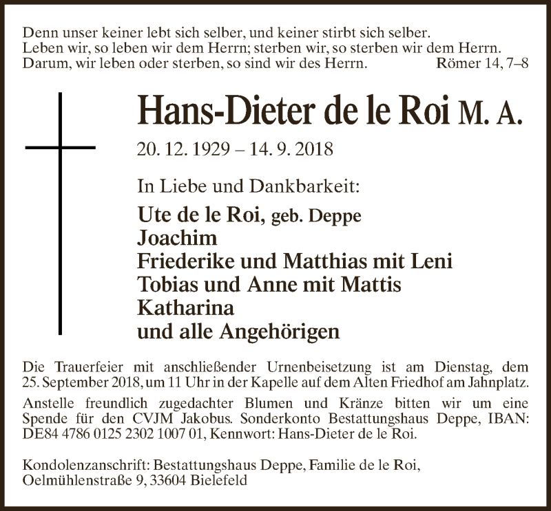 Hier finden Sie alle Traueranzeigen aus der Zeitung, die bisher für Hans-Dieter de le Roi erschienen sind. Weitere Traueranzeigen, die in der Zeitung erscheinen, werden hier ebenfalls aufgelistet
