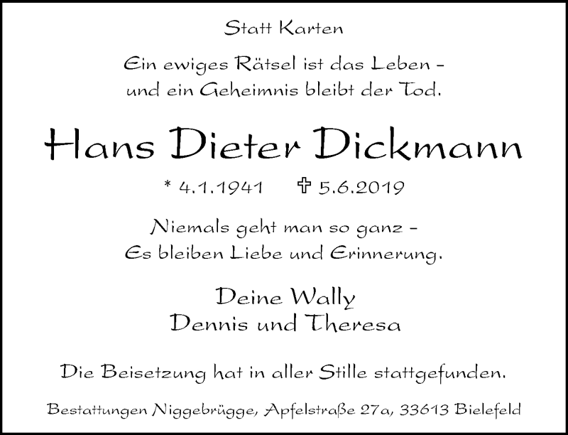 Hier finden Sie alle Traueranzeigen aus der Zeitung, die bisher für Hans Dieter Dickmann erschienen sind. Weitere Traueranzeigen, die in der Zeitung erscheinen, werden hier ebenfalls aufgelistet