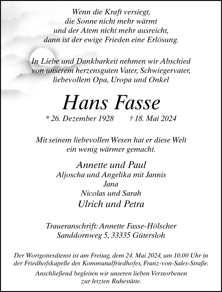 Hier finden Sie alle Traueranzeigen aus der Zeitung, die bisher für Hans Fasse erschienen sind. Weitere Traueranzeigen, die in der Zeitung erscheinen, werden hier ebenfalls aufgelistet