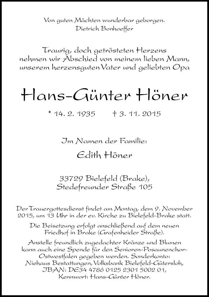 Hier finden Sie alle Traueranzeigen aus der Zeitung, die bisher für Hans-Günter Höner erschienen sind. Weitere Traueranzeigen, die in der Zeitung erscheinen, werden hier ebenfalls aufgelistet