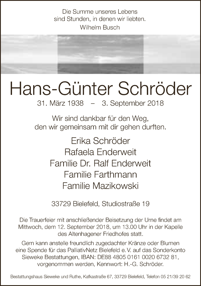 Hier finden Sie alle Traueranzeigen aus der Zeitung, die bisher für Hans-Günter Schröder erschienen sind. Weitere Traueranzeigen, die in der Zeitung erscheinen, werden hier ebenfalls aufgelistet