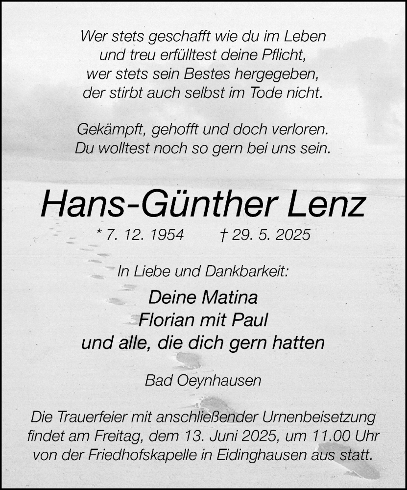 Hier finden Sie alle Traueranzeigen aus der Zeitung, die bisher für Hans-Günther Lenz erschienen sind. Weitere Traueranzeigen, die in der Zeitung erscheinen, werden hier ebenfalls aufgelistet