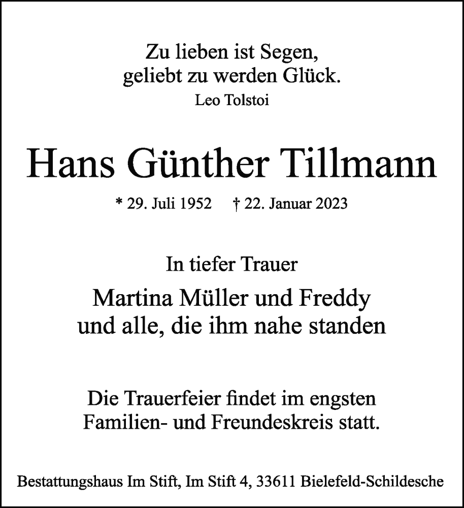 Hier finden Sie alle Traueranzeigen aus der Zeitung, die bisher für Hans Günther Tillmann erschienen sind. Weitere Traueranzeigen, die in der Zeitung erscheinen, werden hier ebenfalls aufgelistet