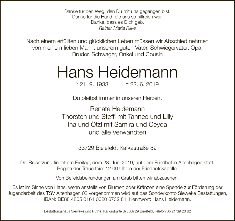 Hier finden Sie alle Traueranzeigen aus der Zeitung, die bisher für Hans Heidemann erschienen sind. Weitere Traueranzeigen, die in der Zeitung erscheinen, werden hier ebenfalls aufgelistet