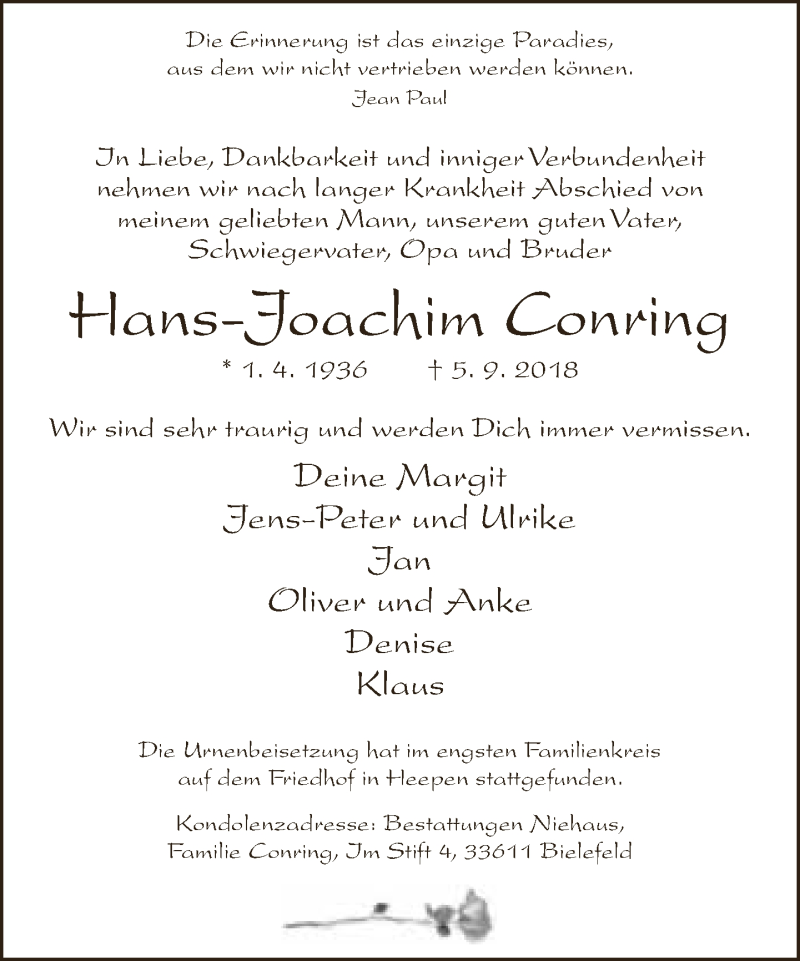 Hier finden Sie alle Traueranzeigen aus der Zeitung, die bisher für Hans-Joachim Conving erschienen sind. Weitere Traueranzeigen, die in der Zeitung erscheinen, werden hier ebenfalls aufgelistet