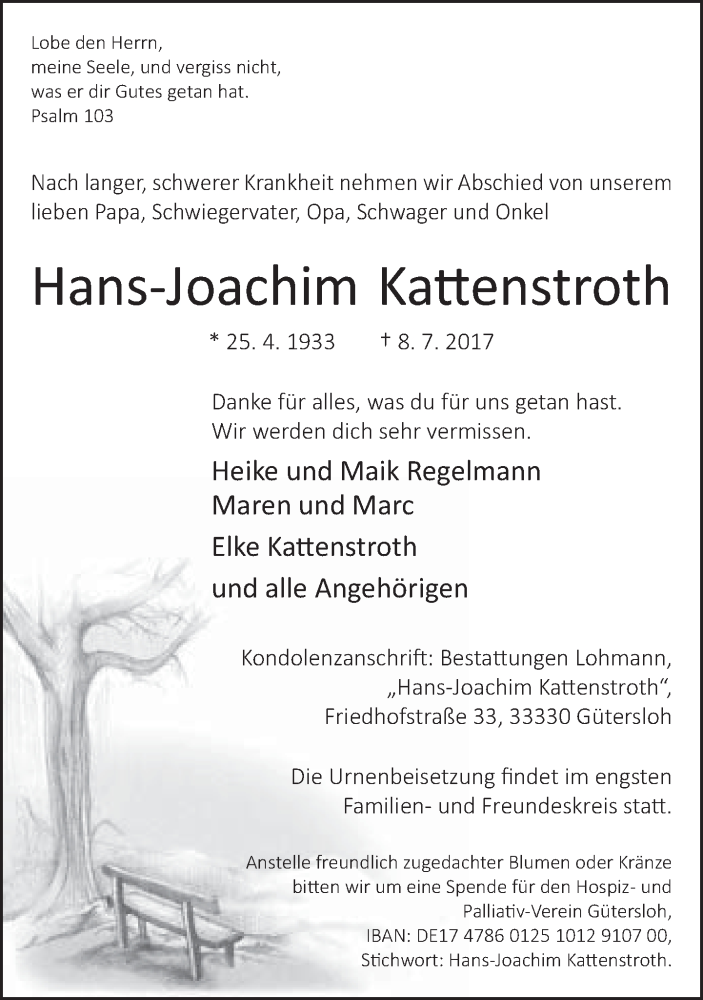 Hier finden Sie alle Traueranzeigen aus der Zeitung, die bisher für Hans-Joachim Kattenstroth erschienen sind. Weitere Traueranzeigen, die in der Zeitung erscheinen, werden hier ebenfalls aufgelistet