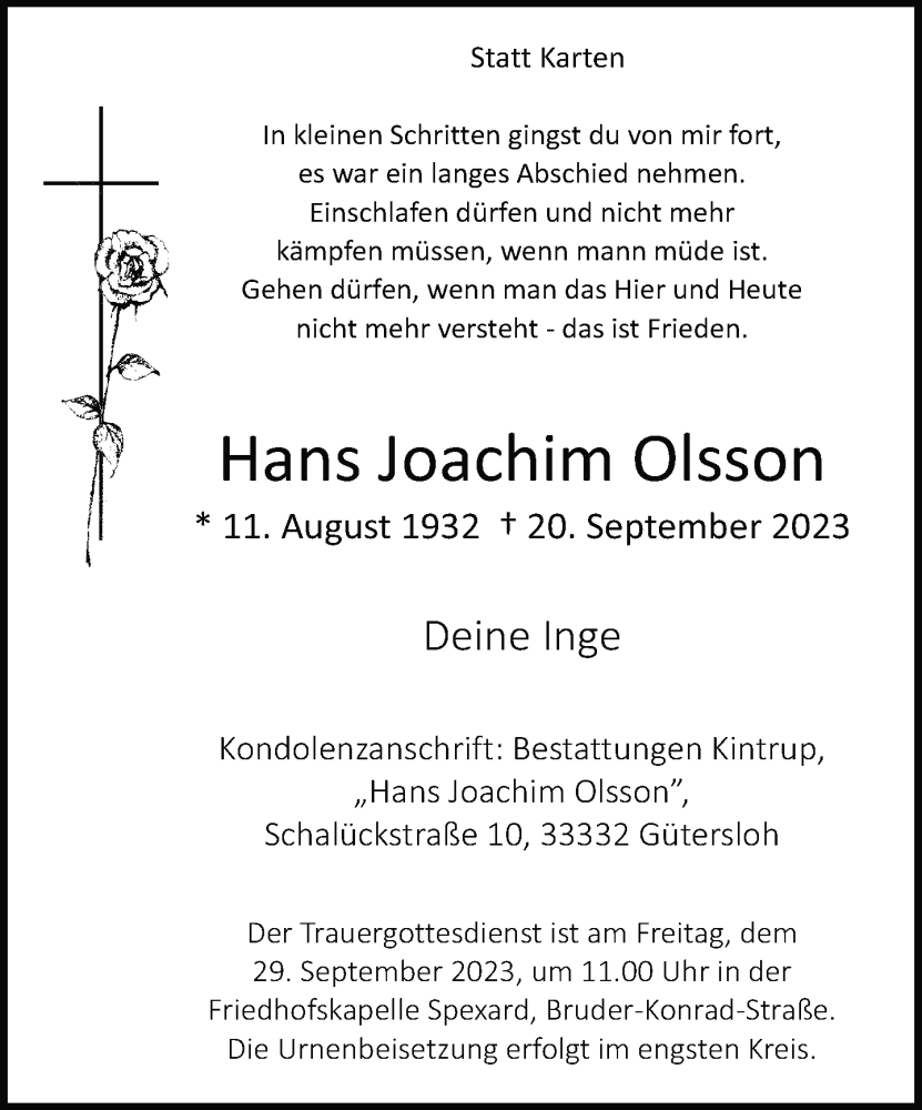 Hier finden Sie alle Traueranzeigen aus der Zeitung, die bisher für Hans Joachim Olsson erschienen sind. Weitere Traueranzeigen, die in der Zeitung erscheinen, werden hier ebenfalls aufgelistet