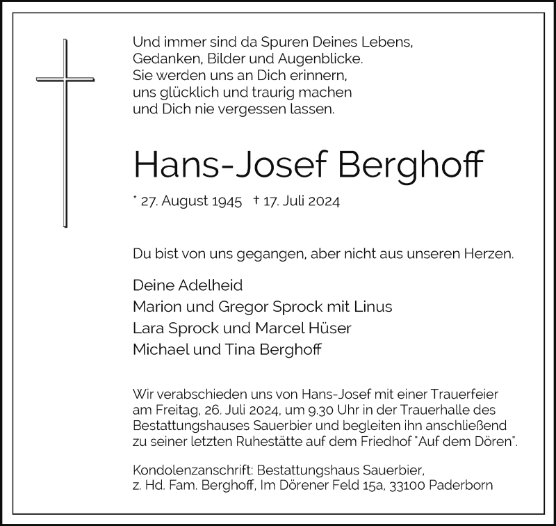 Hier finden Sie alle Traueranzeigen aus der Zeitung, die bisher für Hans-Josef Berghoff erschienen sind. Weitere Traueranzeigen, die in der Zeitung erscheinen, werden hier ebenfalls aufgelistet