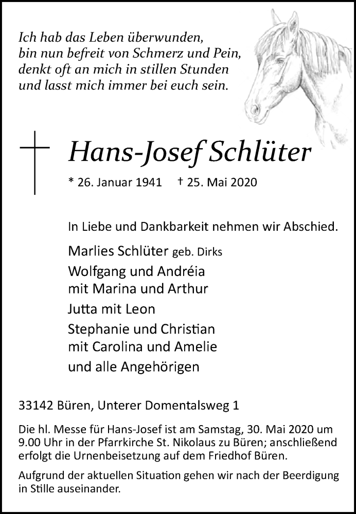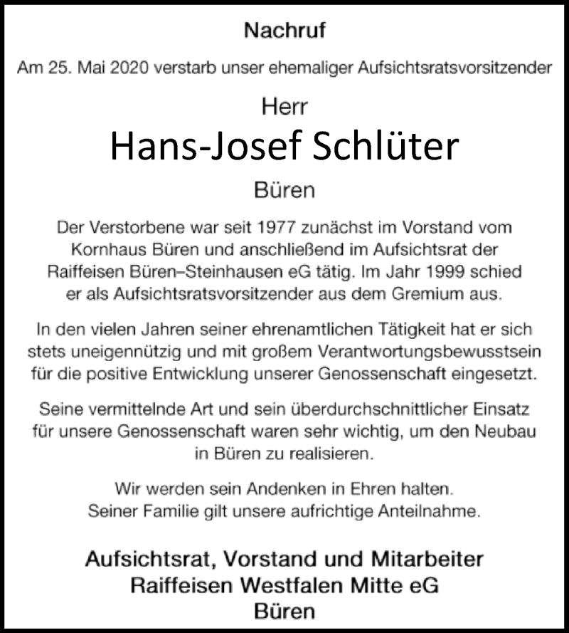 Hier finden Sie alle Traueranzeigen aus der Zeitung, die bisher für Hans-Josef Schlüter erschienen sind. Weitere Traueranzeigen, die in der Zeitung erscheinen, werden hier ebenfalls aufgelistet