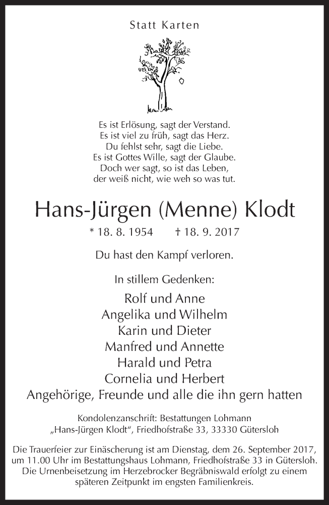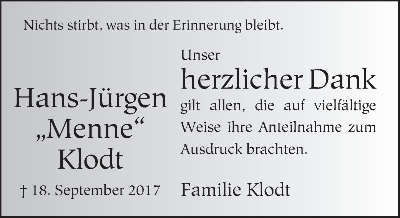Hier finden Sie alle Traueranzeigen aus der Zeitung, die bisher für Hans-Jürgen Klodt erschienen sind. Weitere Traueranzeigen, die in der Zeitung erscheinen, werden hier ebenfalls aufgelistet