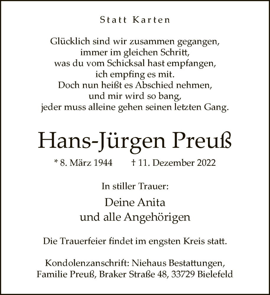 Hier finden Sie alle Traueranzeigen aus der Zeitung, die bisher für Hans-Jürgen Preuß erschienen sind. Weitere Traueranzeigen, die in der Zeitung erscheinen, werden hier ebenfalls aufgelistet