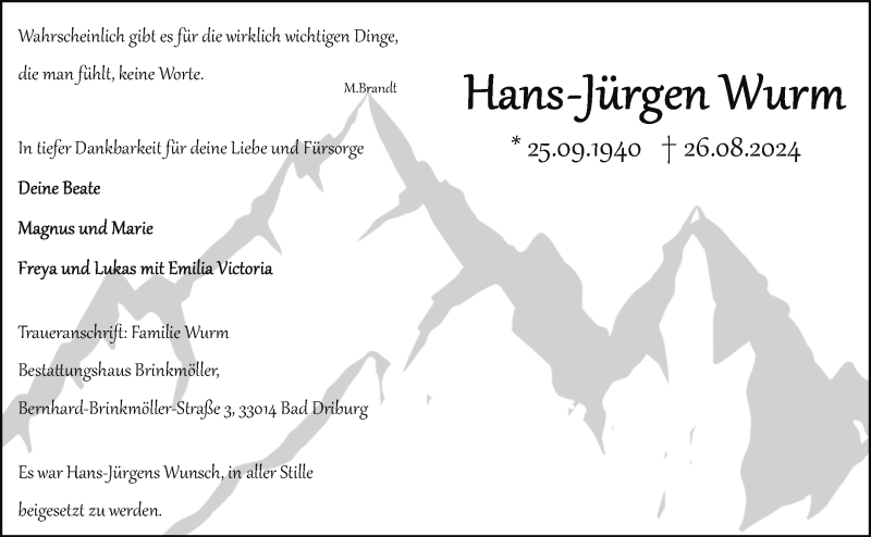 Hier finden Sie alle Traueranzeigen aus der Zeitung, die bisher für Hans-Jürgen Wurm erschienen sind. Weitere Traueranzeigen, die in der Zeitung erscheinen, werden hier ebenfalls aufgelistet