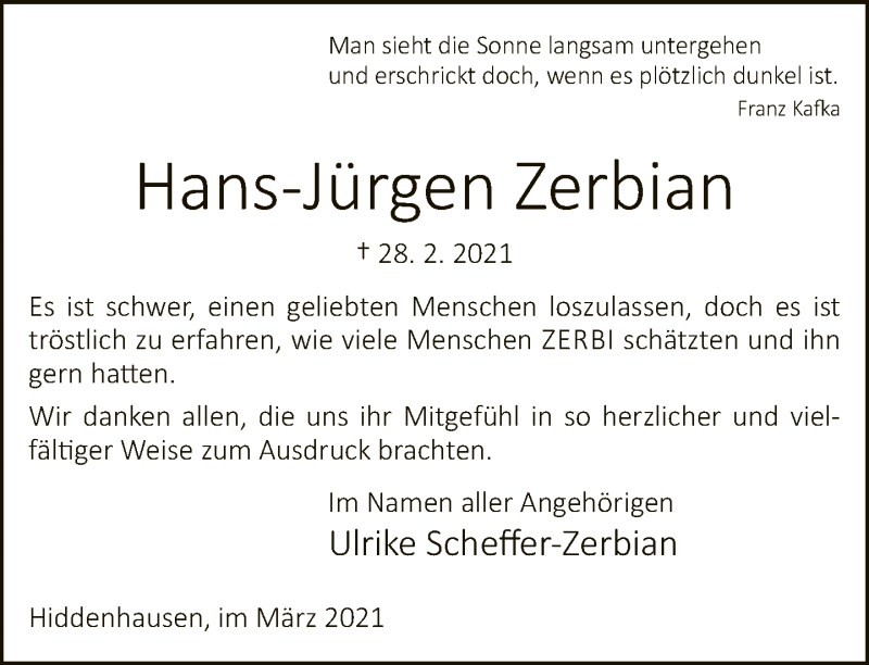 Hier finden Sie alle Traueranzeigen aus der Zeitung, die bisher für Hans-Jürgen Zerbian erschienen sind. Weitere Traueranzeigen, die in der Zeitung erscheinen, werden hier ebenfalls aufgelistet