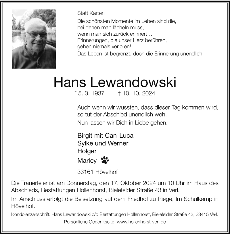 Hier finden Sie alle Traueranzeigen aus der Zeitung, die bisher für Hans Lewandowski erschienen sind. Weitere Traueranzeigen, die in der Zeitung erscheinen, werden hier ebenfalls aufgelistet