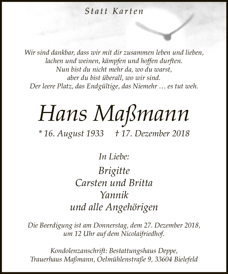 Hier finden Sie alle Traueranzeigen aus der Zeitung, die bisher für Hans Maßmann erschienen sind. Weitere Traueranzeigen, die in der Zeitung erscheinen, werden hier ebenfalls aufgelistet
