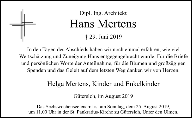 Hier finden Sie alle Traueranzeigen aus der Zeitung, die bisher für Hans Mertens erschienen sind. Weitere Traueranzeigen, die in der Zeitung erscheinen, werden hier ebenfalls aufgelistet
