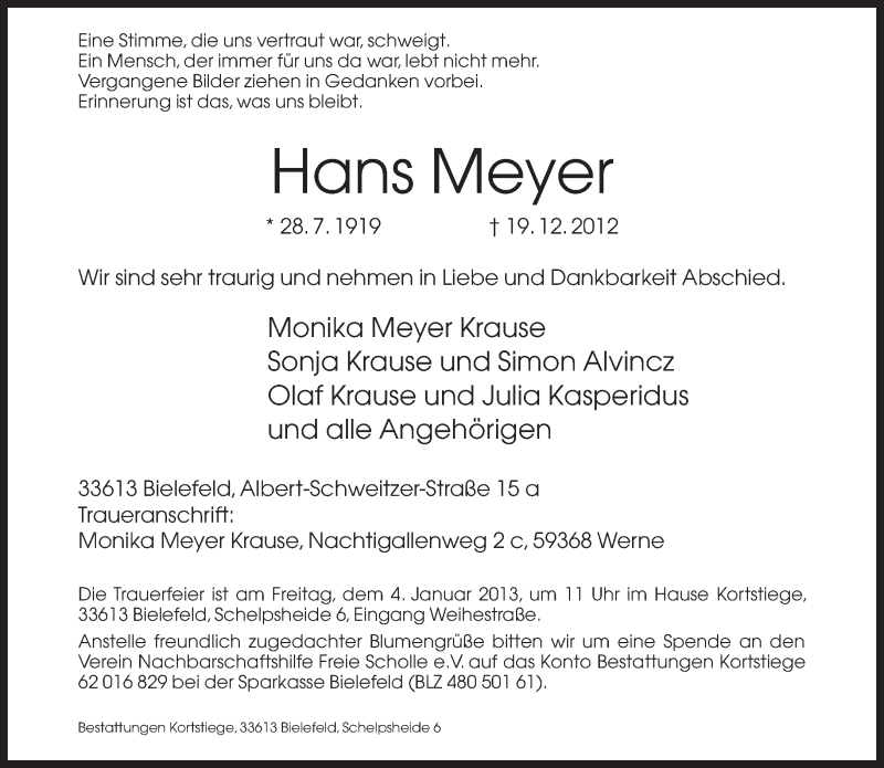 Hier finden Sie alle Traueranzeigen aus der Zeitung, die bisher für Hans Meyer erschienen sind. Weitere Traueranzeigen, die in der Zeitung erscheinen, werden hier ebenfalls aufgelistet