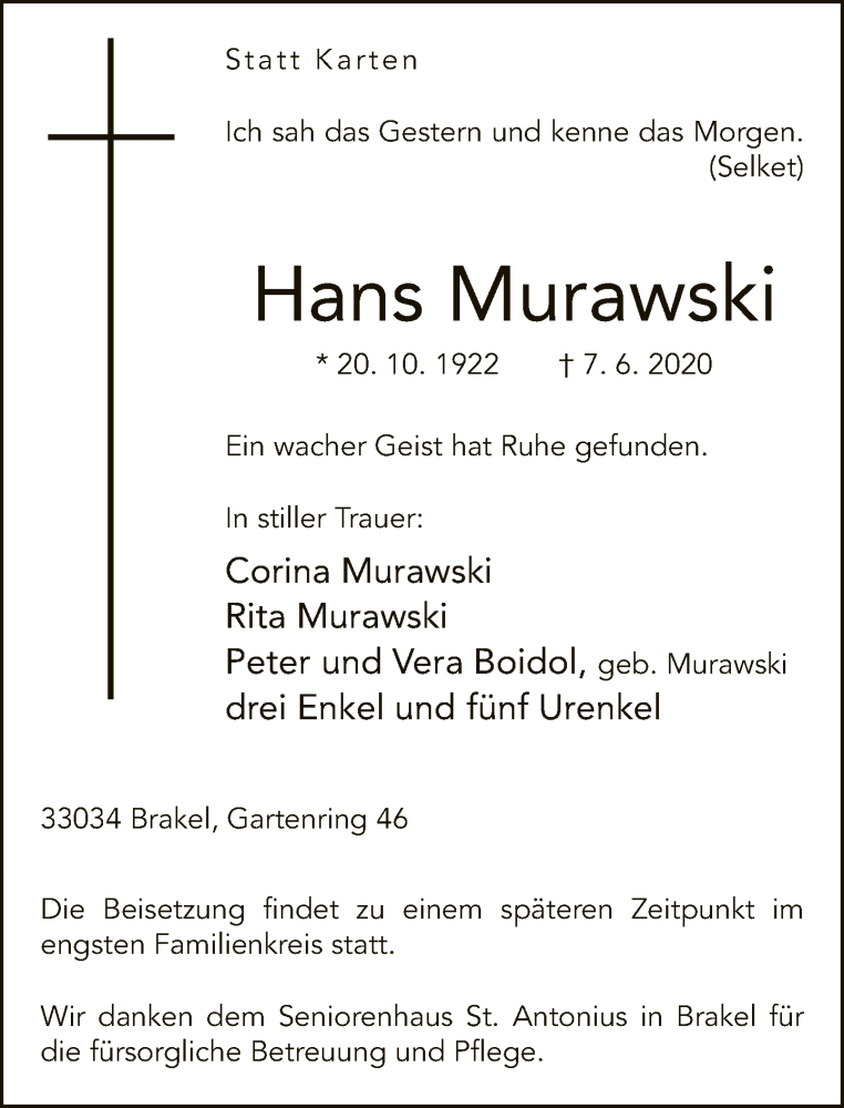 Hier finden Sie alle Traueranzeigen aus der Zeitung, die bisher für Hans Murawski erschienen sind. Weitere Traueranzeigen, die in der Zeitung erscheinen, werden hier ebenfalls aufgelistet