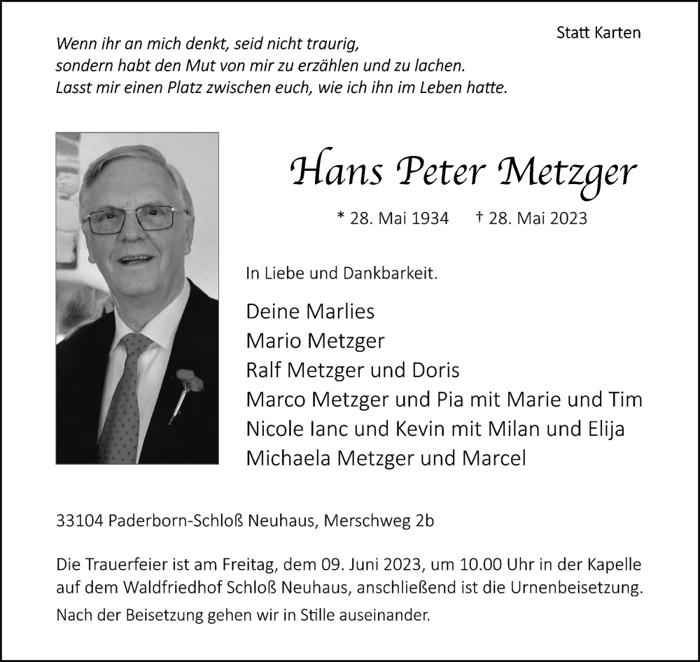 Hier finden Sie alle Traueranzeigen aus der Zeitung, die bisher für Hans Peter Metzger erschienen sind. Weitere Traueranzeigen, die in der Zeitung erscheinen, werden hier ebenfalls aufgelistet