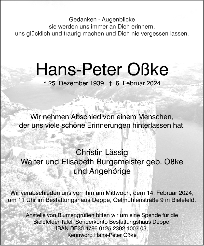 Hier finden Sie alle Traueranzeigen aus der Zeitung, die bisher für Hans-Peter Oßke erschienen sind. Weitere Traueranzeigen, die in der Zeitung erscheinen, werden hier ebenfalls aufgelistet