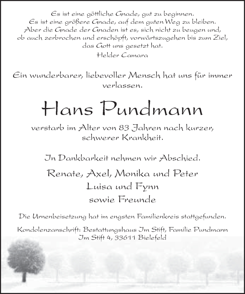 Hier finden Sie alle Traueranzeigen aus der Zeitung, die bisher für Hans Pundmann erschienen sind. Weitere Traueranzeigen, die in der Zeitung erscheinen, werden hier ebenfalls aufgelistet