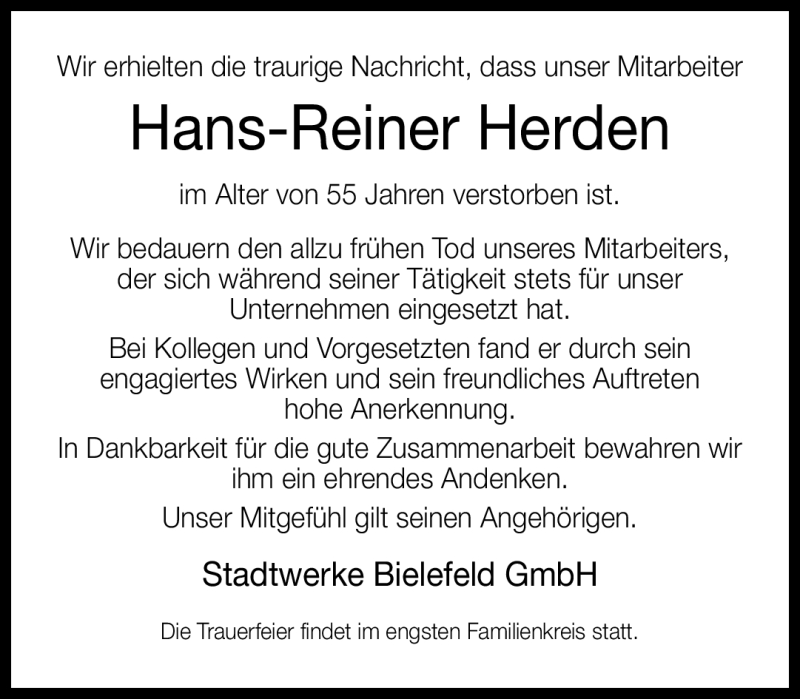 Hier finden Sie alle Traueranzeigen aus der Zeitung, die bisher für Hans-Reiner Herden erschienen sind. Weitere Traueranzeigen, die in der Zeitung erscheinen, werden hier ebenfalls aufgelistet