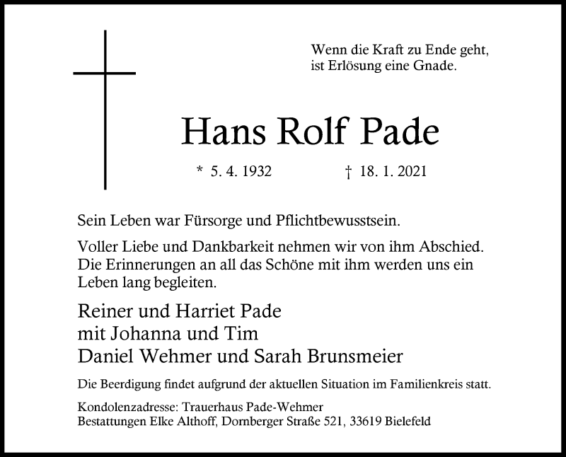 Hier finden Sie alle Traueranzeigen aus der Zeitung, die bisher für Hans Rolf Pade erschienen sind. Weitere Traueranzeigen, die in der Zeitung erscheinen, werden hier ebenfalls aufgelistet