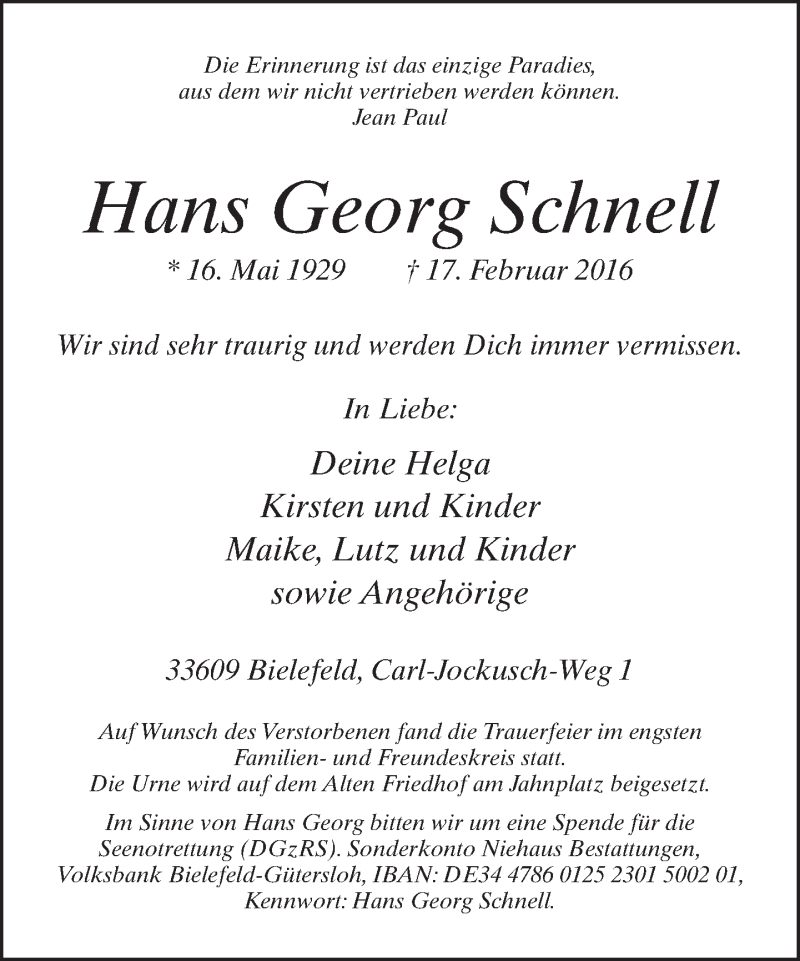 Hier finden Sie alle Traueranzeigen aus der Zeitung, die bisher für Hans Georg Schnell erschienen sind. Weitere Traueranzeigen, die in der Zeitung erscheinen, werden hier ebenfalls aufgelistet