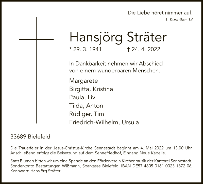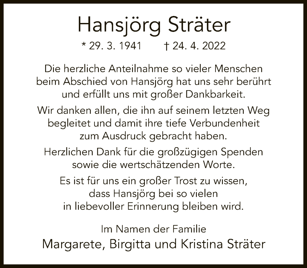 Hier finden Sie alle Traueranzeigen aus der Zeitung, die bisher für Hansjörg Sträter erschienen sind. Weitere Traueranzeigen, die in der Zeitung erscheinen, werden hier ebenfalls aufgelistet