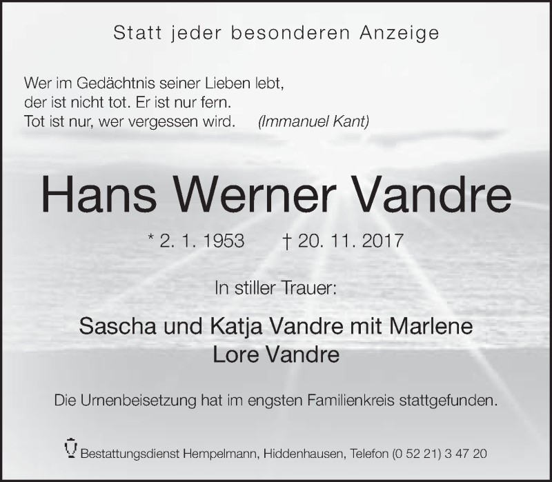 Hier finden Sie alle Traueranzeigen aus der Zeitung, die bisher für Hans Werner Vandre erschienen sind. Weitere Traueranzeigen, die in der Zeitung erscheinen, werden hier ebenfalls aufgelistet