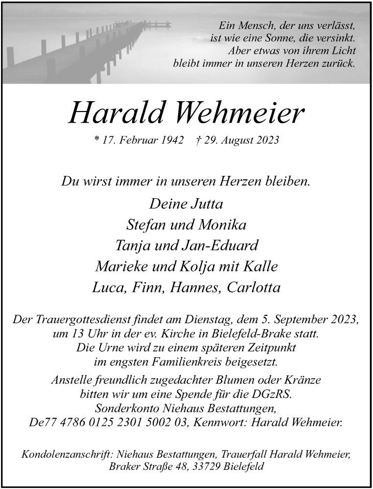 Hier finden Sie alle Traueranzeigen aus der Zeitung, die bisher für Harald Wehmeier erschienen sind. Weitere Traueranzeigen, die in der Zeitung erscheinen, werden hier ebenfalls aufgelistet