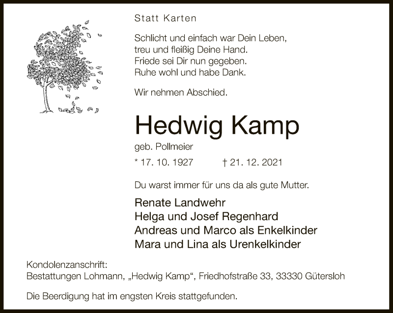 Hier finden Sie alle Traueranzeigen aus der Zeitung, die bisher für Hedwig Kamp erschienen sind. Weitere Traueranzeigen, die in der Zeitung erscheinen, werden hier ebenfalls aufgelistet