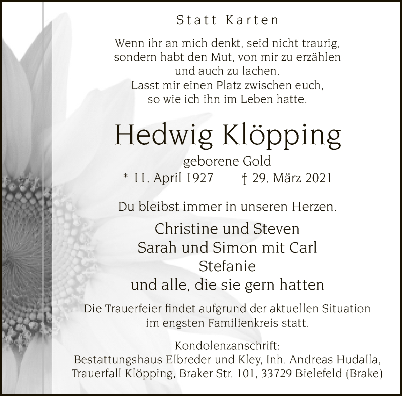 Hier finden Sie alle Traueranzeigen aus der Zeitung, die bisher für Hedwig Klöpping erschienen sind. Weitere Traueranzeigen, die in der Zeitung erscheinen, werden hier ebenfalls aufgelistet