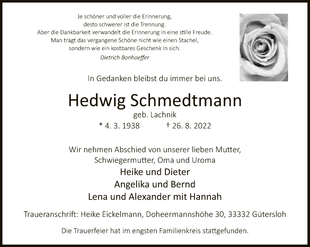 Hier finden Sie alle Traueranzeigen aus der Zeitung, die bisher für Hedwig Schmedtmann erschienen sind. Weitere Traueranzeigen, die in der Zeitung erscheinen, werden hier ebenfalls aufgelistet