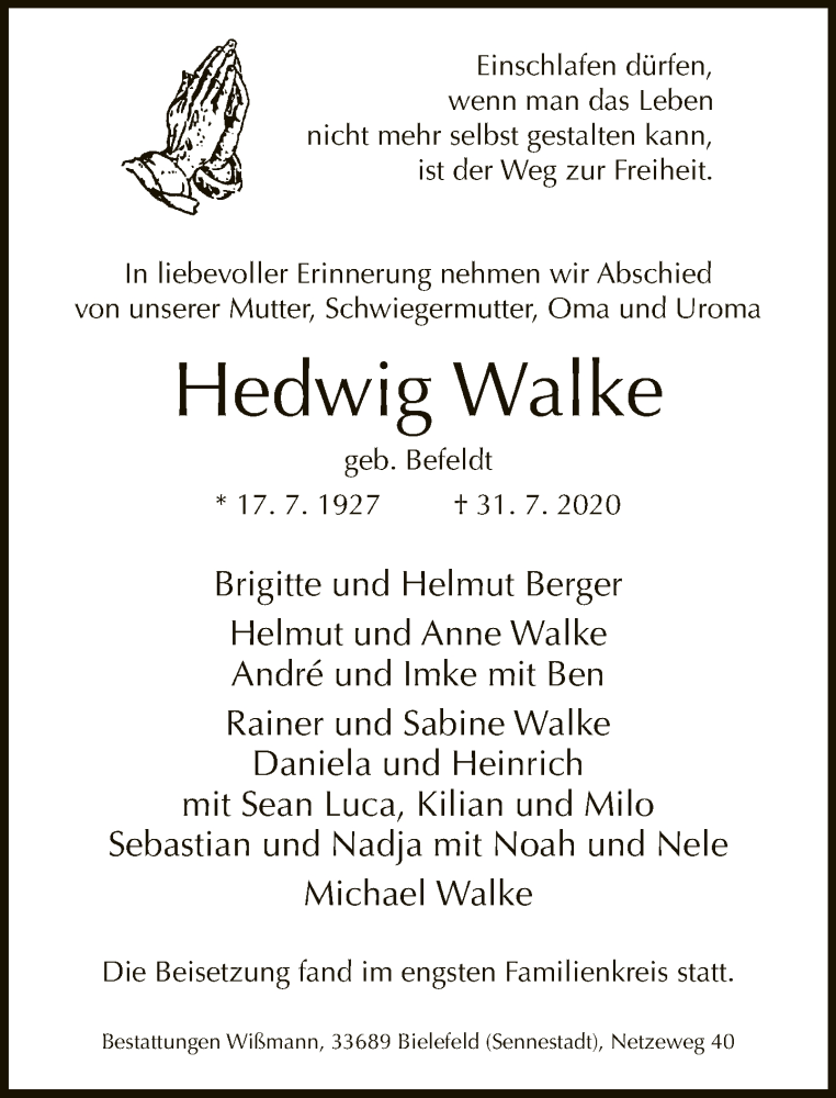 Hier finden Sie alle Traueranzeigen aus der Zeitung, die bisher für Hedwig Walke erschienen sind. Weitere Traueranzeigen, die in der Zeitung erscheinen, werden hier ebenfalls aufgelistet