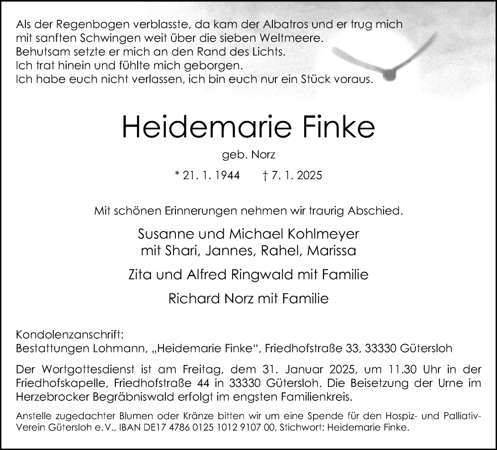 Hier finden Sie alle Traueranzeigen aus der Zeitung, die bisher für Heidemarie Finke erschienen sind. Weitere Traueranzeigen, die in der Zeitung erscheinen, werden hier ebenfalls aufgelistet