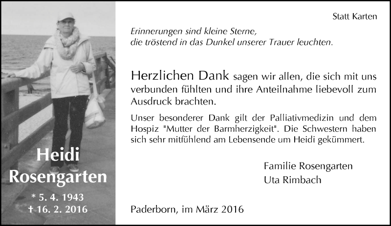 Hier finden Sie alle Traueranzeigen aus der Zeitung, die bisher für Heidi Rosengarten erschienen sind. Weitere Traueranzeigen, die in der Zeitung erscheinen, werden hier ebenfalls aufgelistet