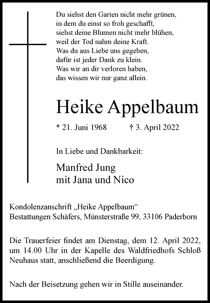 Hier finden Sie alle Traueranzeigen aus der Zeitung, die bisher für Heike Appelbaum erschienen sind. Weitere Traueranzeigen, die in der Zeitung erscheinen, werden hier ebenfalls aufgelistet