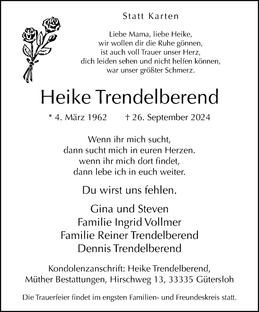 Hier finden Sie alle Traueranzeigen aus der Zeitung, die bisher für Heike Trendelberend erschienen sind. Weitere Traueranzeigen, die in der Zeitung erscheinen, werden hier ebenfalls aufgelistet