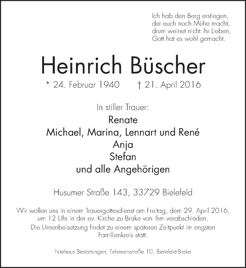 Hier finden Sie alle Traueranzeigen aus der Zeitung, die bisher für Heinrich Büscher erschienen sind. Weitere Traueranzeigen, die in der Zeitung erscheinen, werden hier ebenfalls aufgelistet