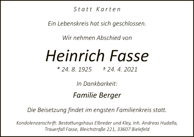 Hier finden Sie alle Traueranzeigen aus der Zeitung, die bisher für Heinrich Fasse erschienen sind. Weitere Traueranzeigen, die in der Zeitung erscheinen, werden hier ebenfalls aufgelistet